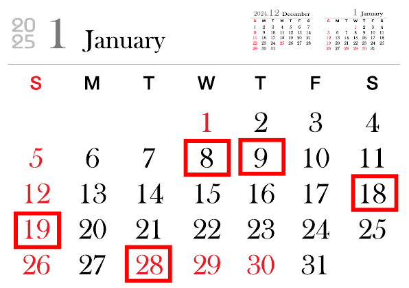 • 1월: 1일, 8일, 9일, 18일, 19일, 26일, 28일