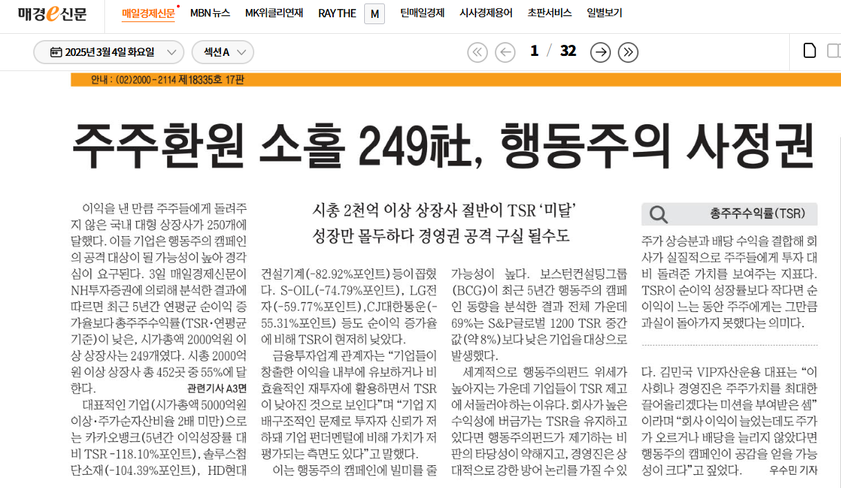 오늘자 신문에 총주주수익률에 관한 기사가 헤드라인으로 있었죠. 관련된 내용들을 한번 살펴보고자 합니다.