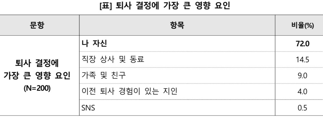 에서 나타난 바와 같이, '나 자신'이라는 요인이 72%로 가장 높은 비율을 차지합니다. 이는 개인의 심리적 상태가 퇴사 결정에 얼마나 큰 영향을 미치는지를 보여줍니다. 또한, 직장 상사 및 동료와의 관계도 14.5%로 적지 않은 영향을 미치고 있습니다. 이러한 관계의 질이 좋지 않으면, 직원은 퇴사를 고려하게 됩니다.