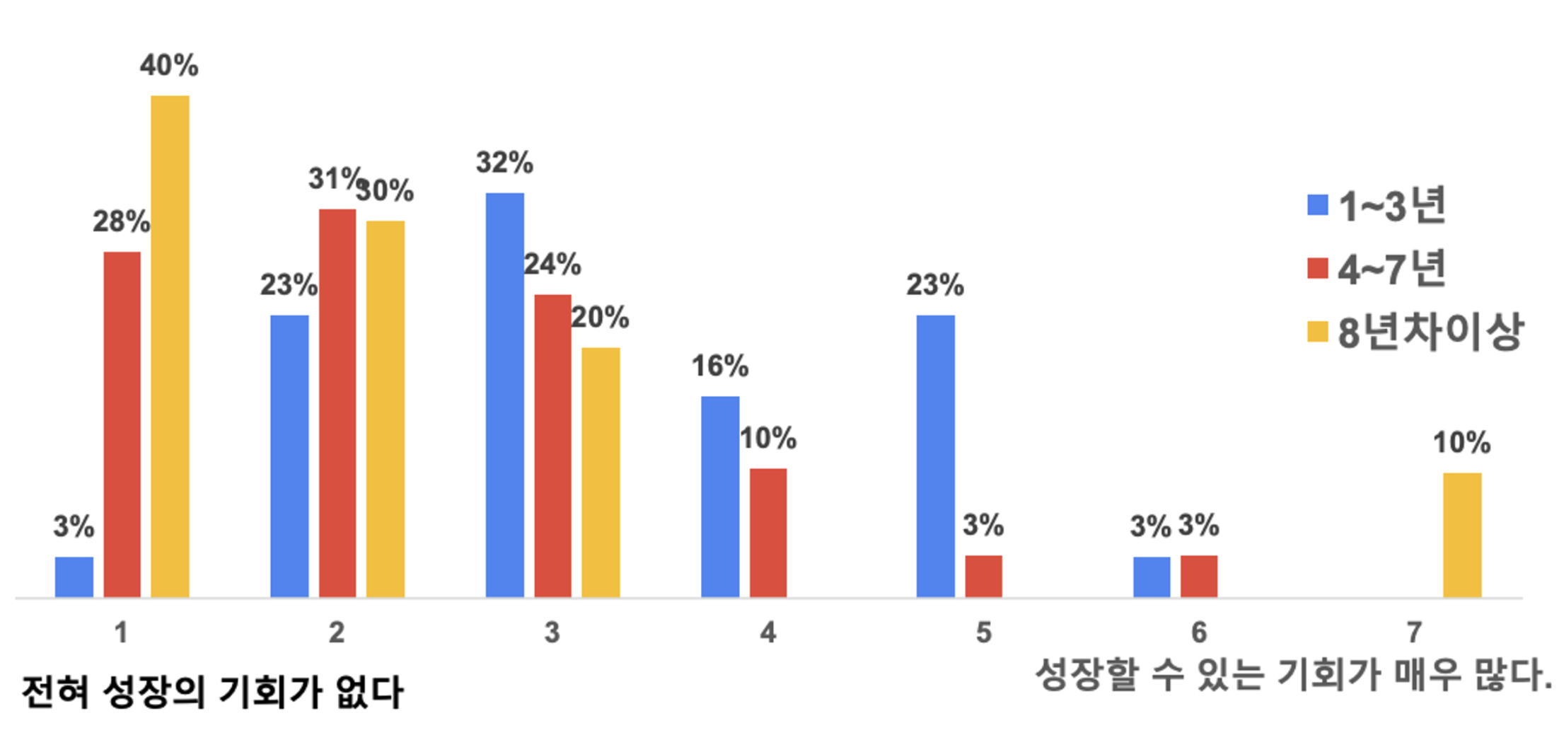 에서는 경력에 따른 성장 기회에 대한 인식 차이를 보여줍니다. 경력이 적은 직원들이 성장 기회를 느끼지 못하는 경우가 많아, 이로 인해 퇴사를 고려하게 되는 경우가 많습니다. 이러한 점을 기업이 인지하고 개선해 나간다면, 직원들의 이직률을 낮출 수 있을 것입니다.